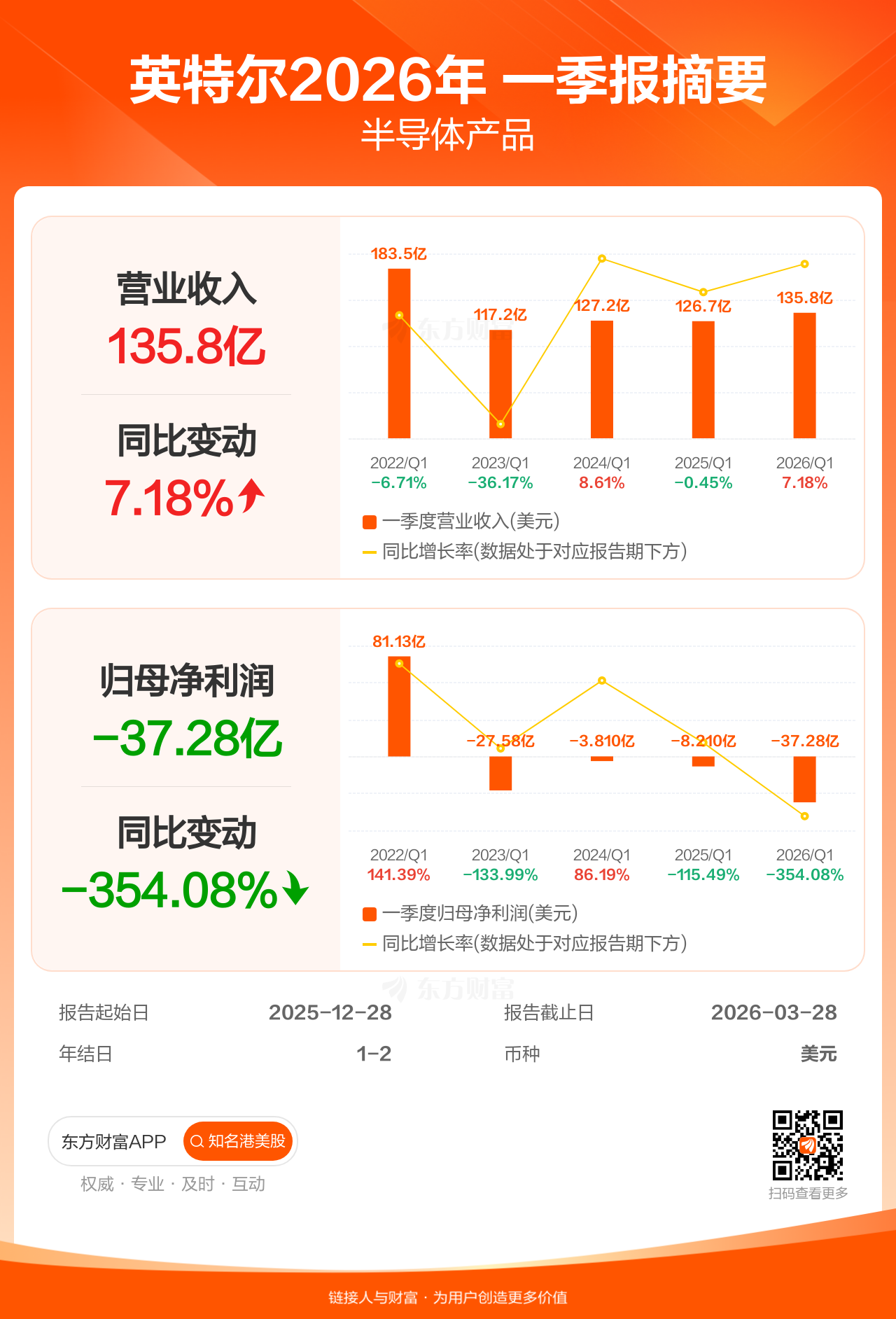 英特尔4月23日发布一季报业绩,截至2026年3月28日的3个月内,该公司营业收入135.77亿美元,同比增长7.18%;公司权益持有人应占溢利(归母净利润)-37.28亿美元,上年同期-8.21亿美元。