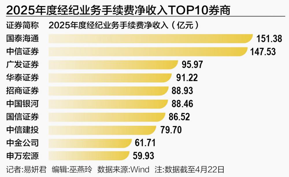 其中,国泰海通、中信证券、广发证券2025年度分别实现经纪业务手续费净收入151.38亿元、147.53亿元、95.97亿元,位列行业前三。