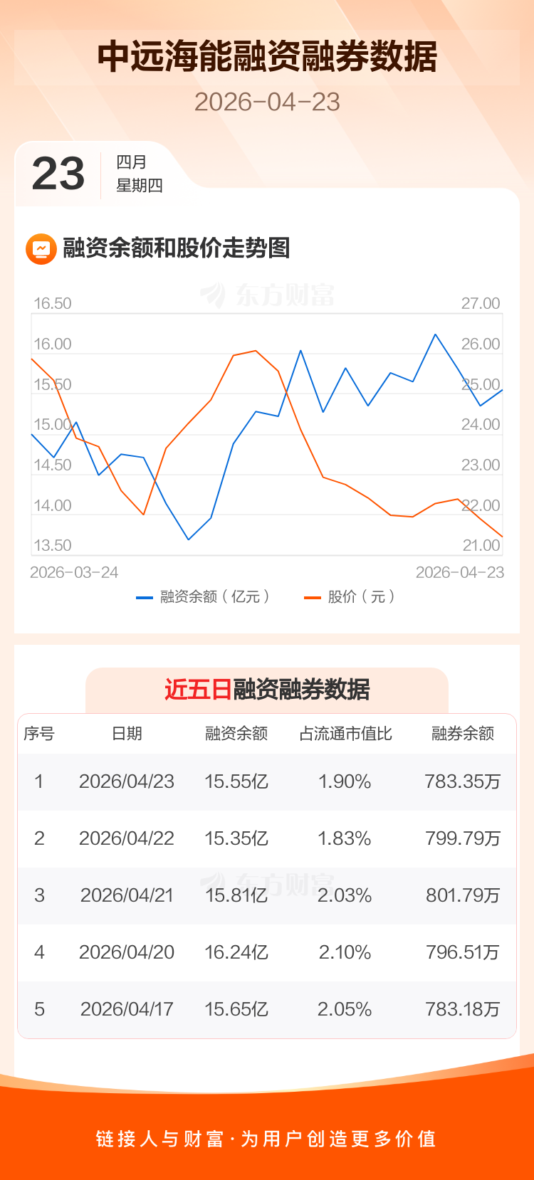 交易所最新数据显示,中远海能于2026年4月23日获融资买入1.35亿元,融资偿还1.14亿元,当日融资净买入2041.12万元。目前,该股融资余额15.55亿,占流通市值比例为1.90%。