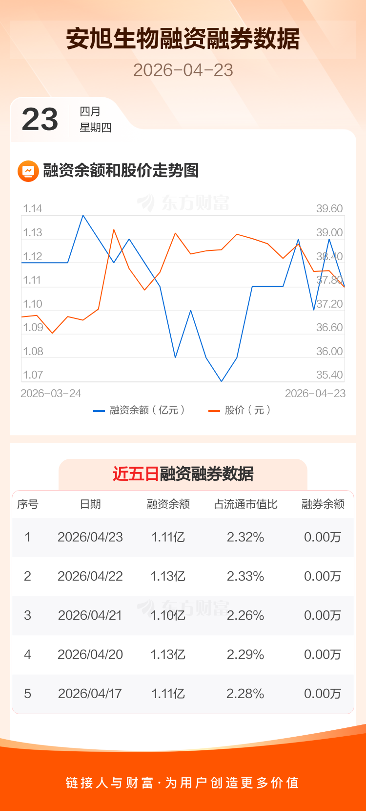 交易所最新数据显示,安旭生物于2026年4月23日获融资买入178.83万元,融资偿还328.91万元,当日融资净偿还150.08万元。目前,该股融资余额1.11亿,占流通市值比例为2.32%。