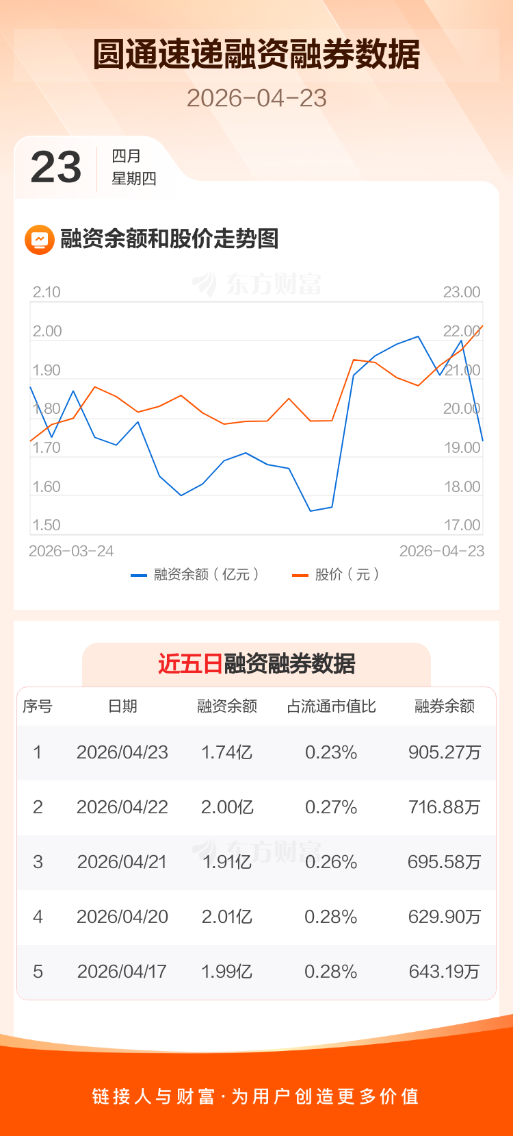 交易所最新数据显示,圆通速递于2026年4月23日获融资买入3747.85万元,融资偿还6288.58万元,当日融资净偿还2540.72万元。目前,该股融资余额1.74亿,占流通市值比例为0.23%。