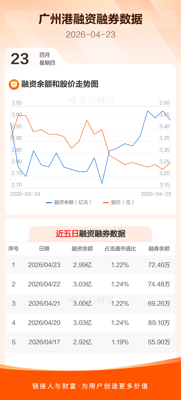 交易所最新数据显示,广州港于2026年4月23日获融资买入1265.73万元,融资偿还1620.25万元,当日融资净偿还354.52万元。目前,该股融资余额2.99亿,占流通市值比例为1.22%。
