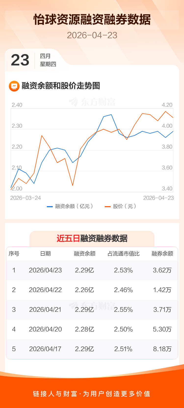 交易所最新数据显示,怡球资源于2026年4月23日获融资买入1903.01万元,融资偿还1615.75万元,当日融资净买入287.26万元。目前,该股融资余额2.29亿,占流通市值比例为2.53%。