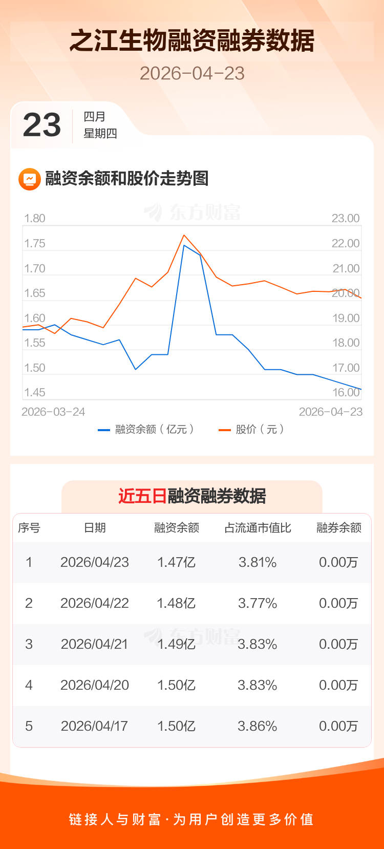 交易所最新数据显示,之江生物于2026年4月23日获融资买入346.81万元,融资偿还426.80万元,当日融资净偿还79.99万元。目前,该股融资余额1.47亿,占流通市值比例为3.81%。