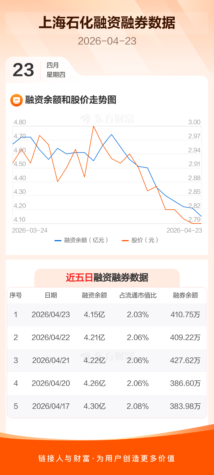 交易所最新数据显示,上海石化于2026年4月23日获融资买入791.97万元,融资偿还1379.65万元,当日融资净偿还587.68万元。目前,该股融资余额4.15亿,占流通市值比例为2.03%。