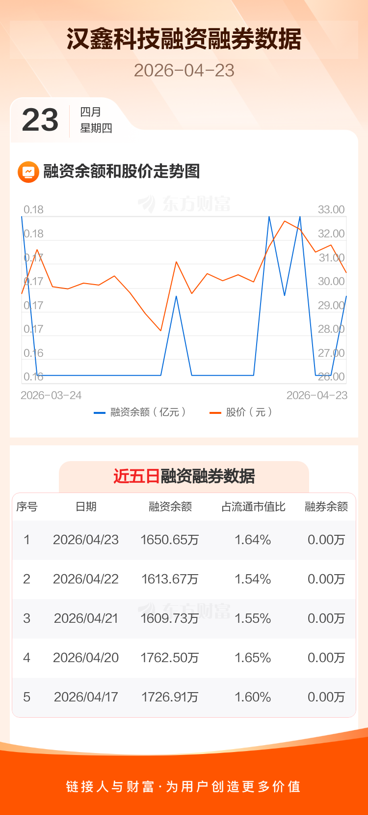 交易所最新数据显示,汉鑫科技于2026年4月23日获融资买入72.75万元,融资偿还35.78万元,当日融资净买入36.98万元。目前,该股融资余额1650.65万,占流通市值比例为1.64%。