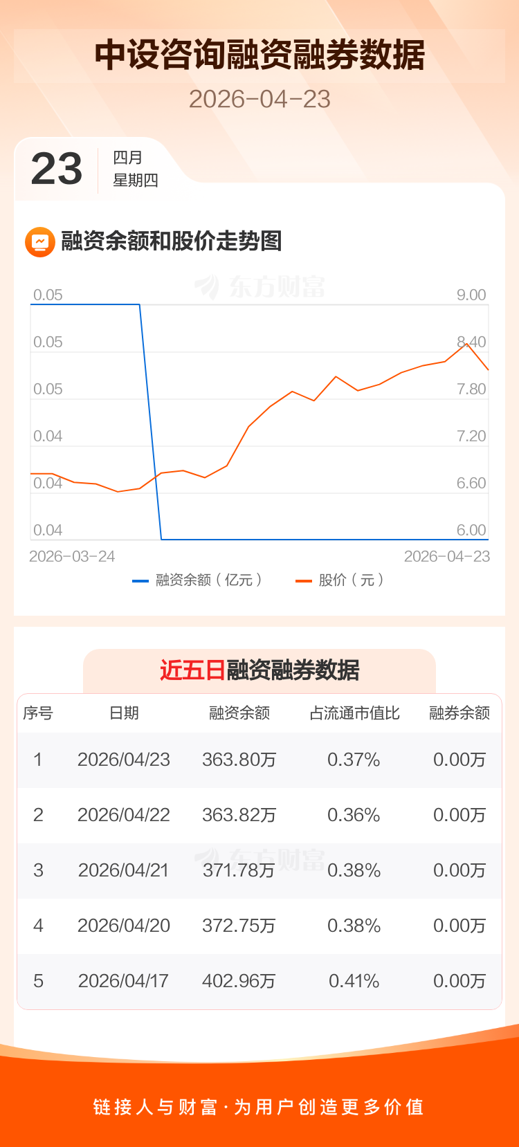 交易所最新数据显示,中设咨询于2026年4月23日获融资买入0元,融资偿还274元,当日融资净偿还274元。目前,该股融资余额363.80万,占流通市值比例为0.37%。
