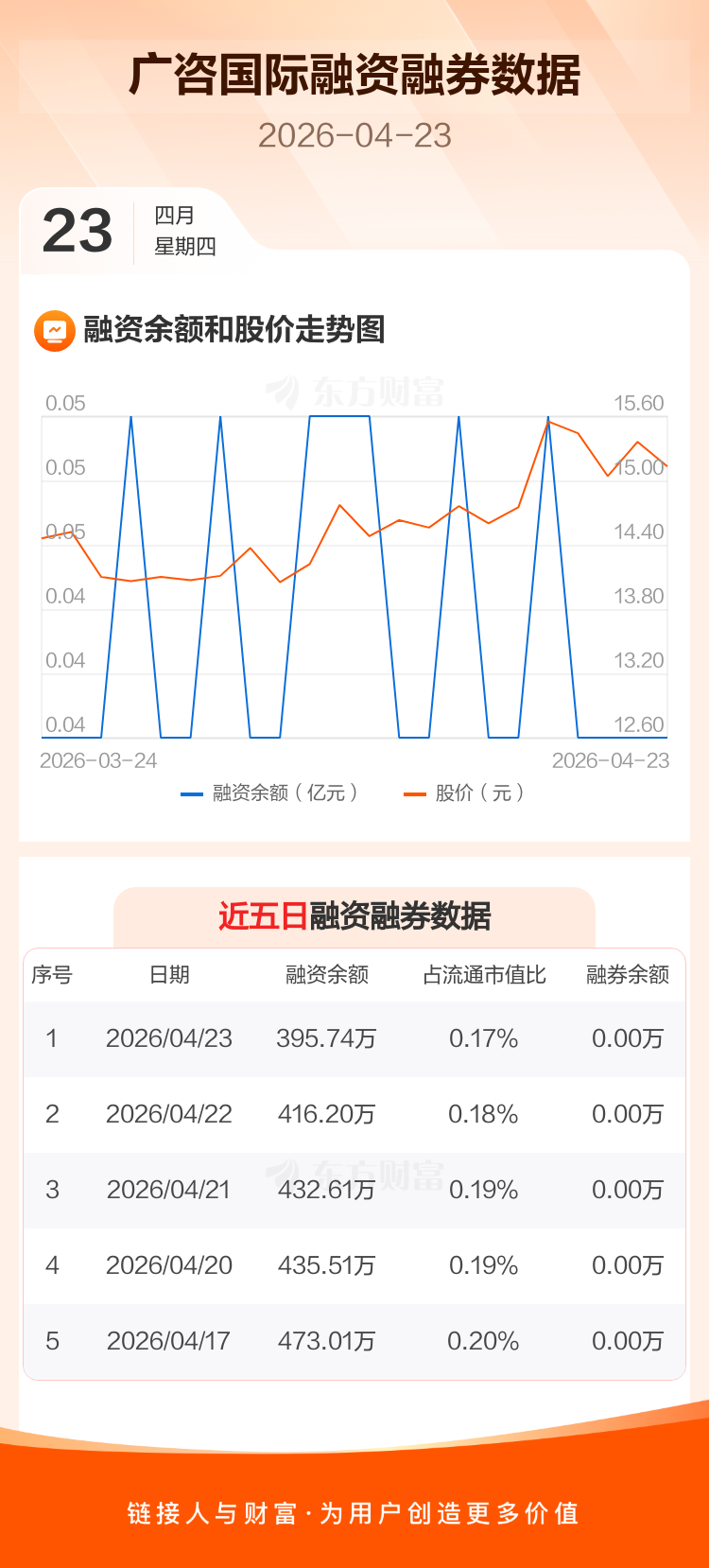 交易所最新数据显示,广咨国际于2026年4月23日获融资买入104.36万元,融资偿还124.82万元,当日融资净偿还20.46万元。目前,该股融资余额395.74万,占流通市值比例为0.17%。