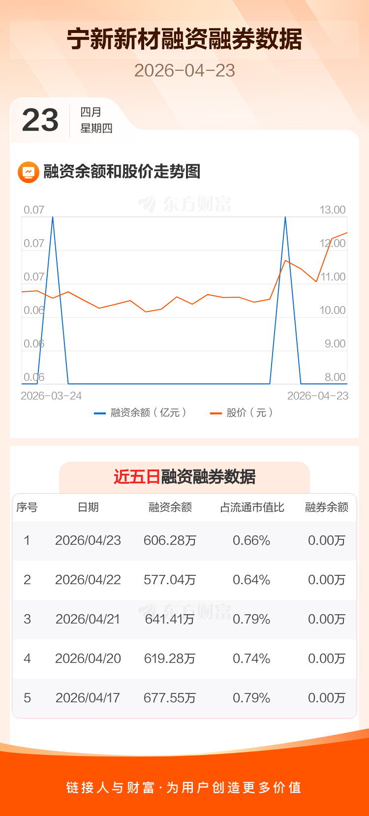 交易所最新数据显示,宁新新材于2026年4月23日获融资买入111.35万元,融资偿还82.11万元,当日融资净买入29.24万元。目前,该股融资余额606.28万,占流通市值比例为0.66%。