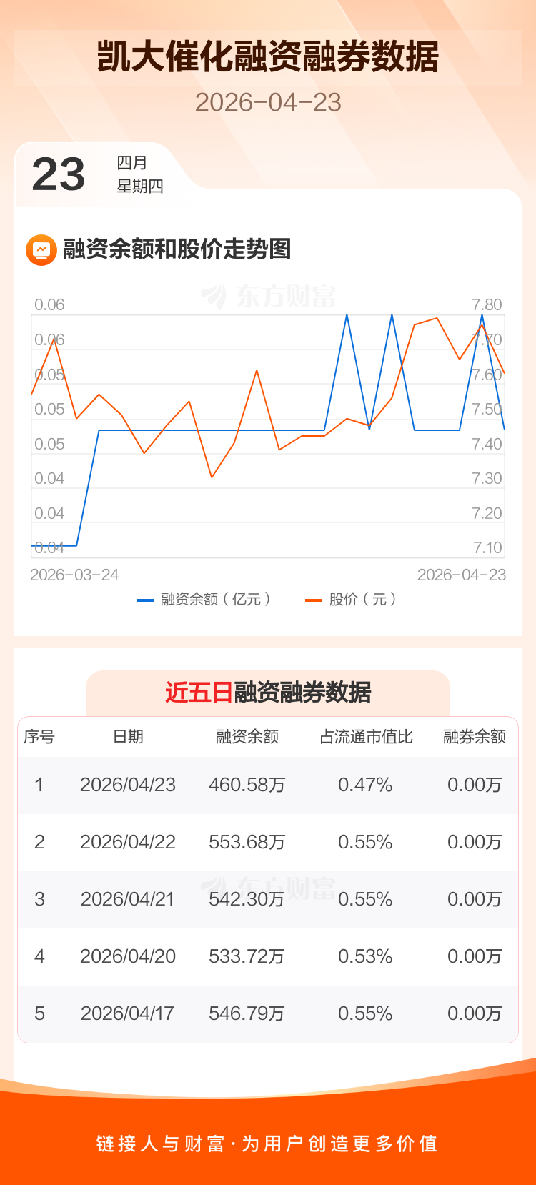 交易所最新数据显示,凯大催化于2026年4月23日获融资买入2243元,融资偿还93.33万元,当日融资净偿还93.11万元。目前,该股融资余额460.58万,占流通市值比例为0.47%。