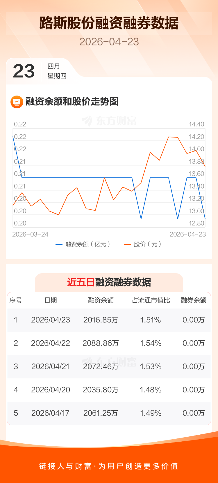交易所最新数据显示,路斯股份于2026年4月23日获融资买入71.55万元,融资偿还143.55万元,当日融资净偿还72.01万元。目前,该股融资余额2016.85万,占流通市值比例为1.51%。