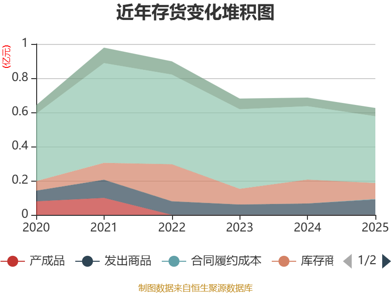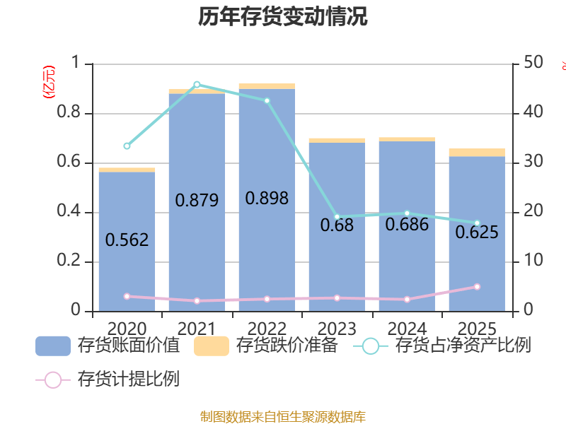从存货变动来看,截至2025年末,公司存货账面价值为6251.56万元,占净资产的17.78%,较上年末减少606.1万元。其中,存货跌价准备为321.15万元,计提比例为4.89%。
