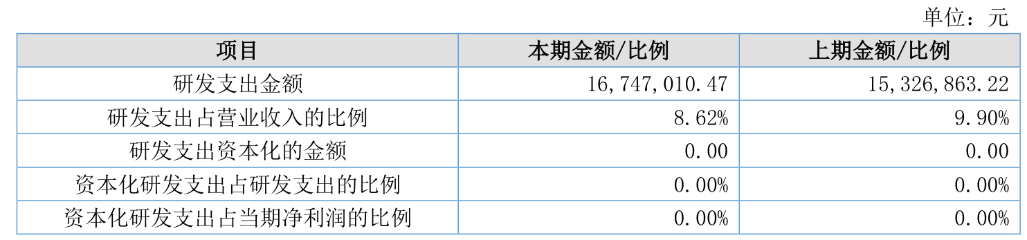 2025年全年,公司研发投入金额为1674.7万元,同比增长9.27%;研发投入占营业收入比例为8.62%,相比上年同期下降1.28个百分点。此外,公司全年研发投入资本化率为0%。