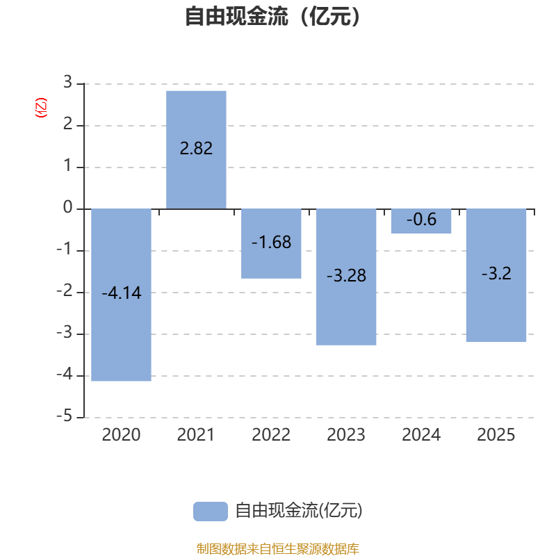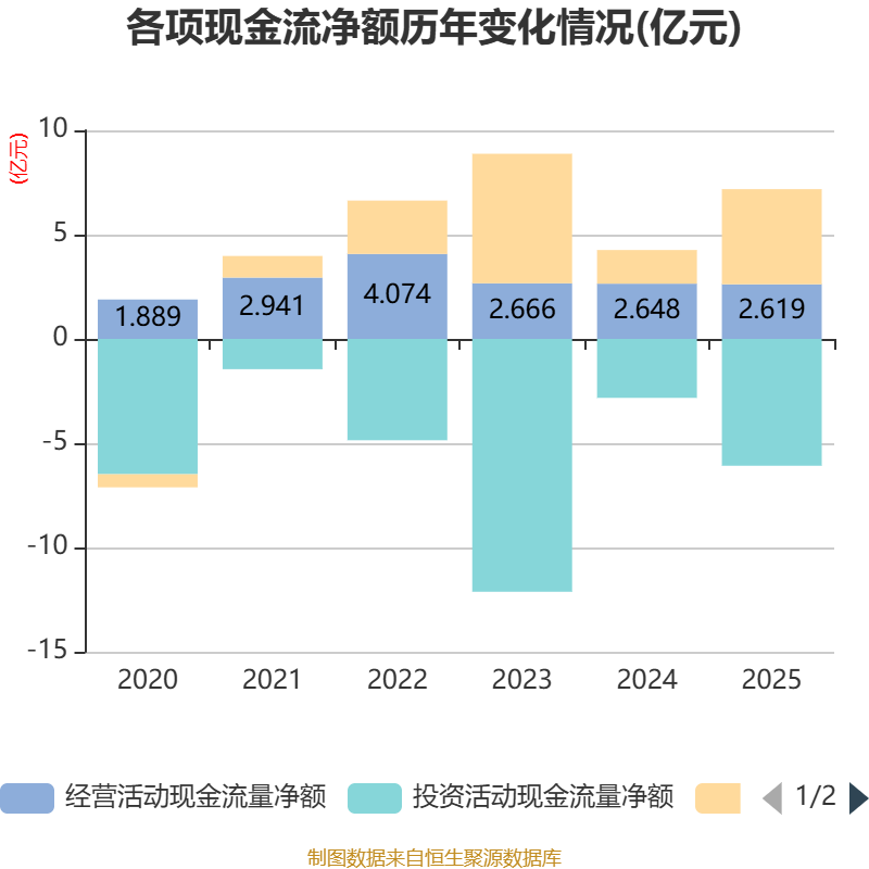 截至2025年,公司经营活动现金流净额为2.62亿元,同比下降1.1%;筹资活动现金流净额4.56亿元,同比增加2.95亿元;投资活动现金流净额-6.08亿元,上年同期为-2.83亿元。