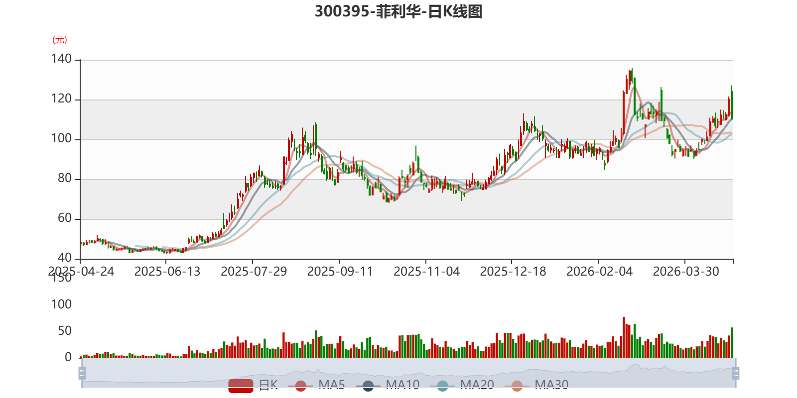 以4月23日收盘价计算,菲利华目前市盈率(TTM)约为129.85倍,市净率(LF)约12.44倍,市销率(TTM)约28.54倍。