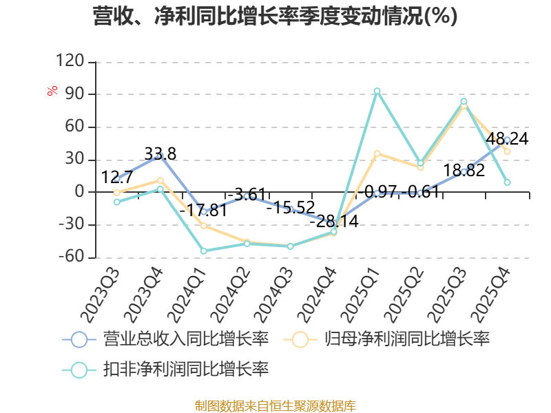 资产重大变化方面,截至2025年末,公司其他非流动金融资产较上年末减少46.1%,占公司总资产比重下降4.12个百分点;交易性金融资产合计较上年末增加80.57%,占公司总资产比重上升3.18个百分点;应收票据及应收账款较上年末增加36.47%,占公司总资产比重上升1.65个百分点;在建工程合计较上年末减少22.09%,占公司总资产比重下降1.55个百分点。