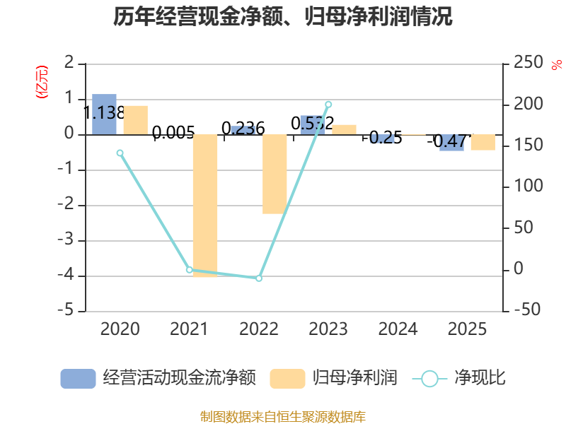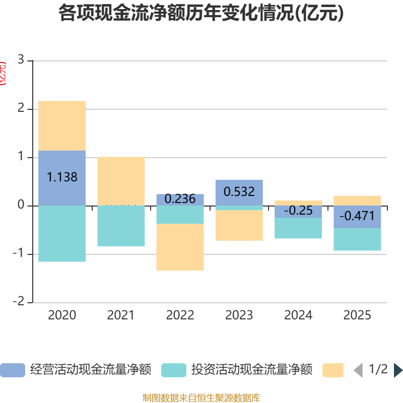 截至2025年,公司经营活动现金流净额为-4711.8万元,同比减少2214.39万元;筹资活动现金流净额2013.31万元,同比增加973.97万元;投资活动现金流净额-4610.26万元,上年同期为-4310.78万元。