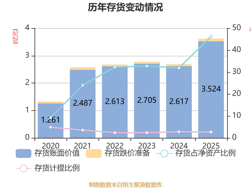 从存货变动来看,截至2025年末,公司存货账面价值为3.52亿元,占净资产的46.2%,较上年末增加9074.59万元。其中,存货跌价准备为970.51万元,计提比例为2.68%。