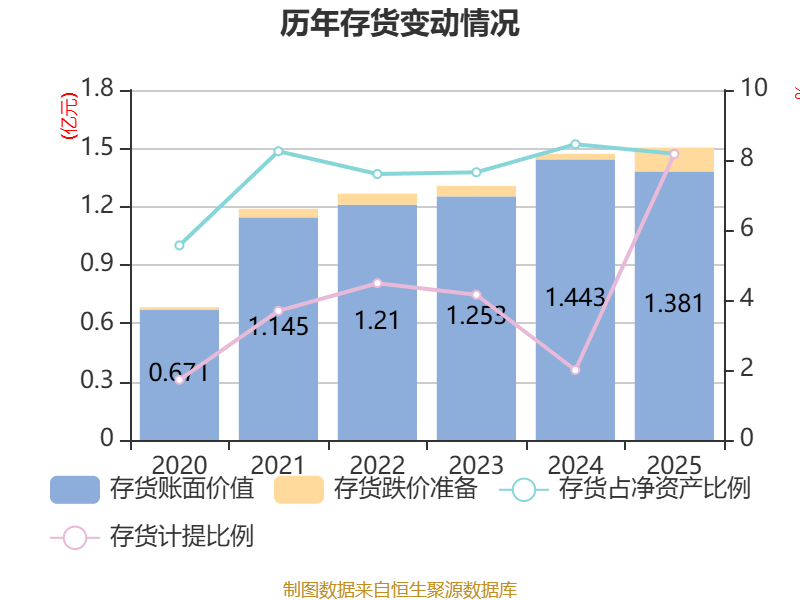 从存货变动来看,截至2025年末,公司存货账面价值为1.38亿元,占净资产的8.18%,较上年末减少619.97万元。其中,存货跌价准备为1228.37万元,计提比例为8.17%。
