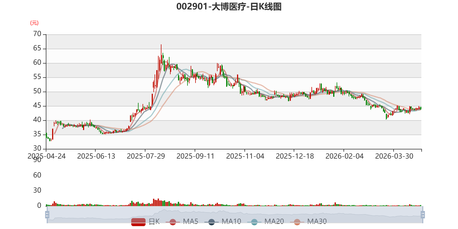 以4月23日收盘价计算,大博医疗目前市盈率(TTM)约为30.28倍,市净率(LF)约5.09倍,市销率(TTM)约6.98倍。