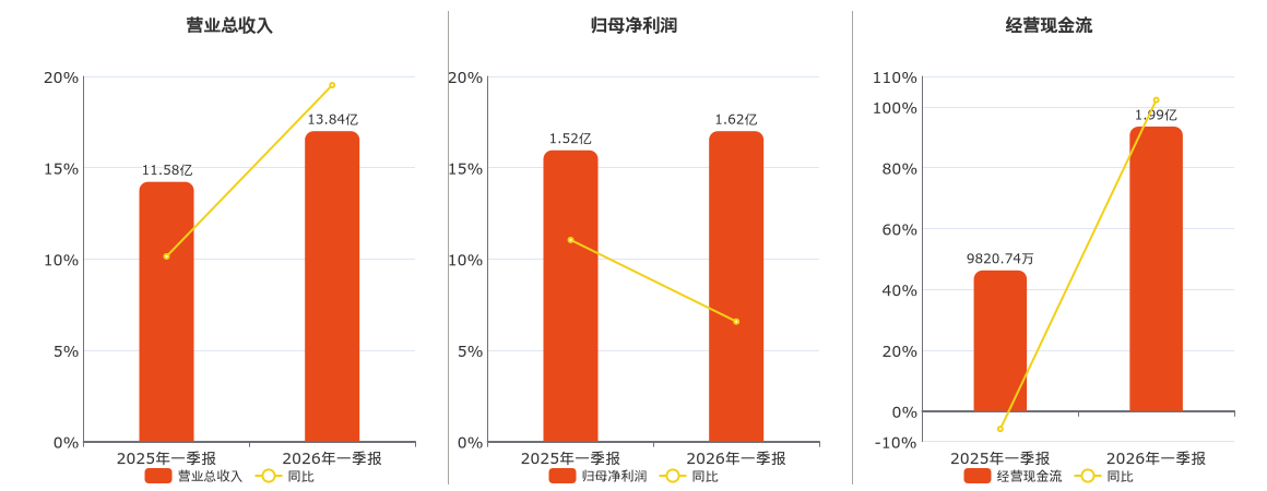 公司营业总收入为13.84亿元,较去年同报告期营业总收入增加2.26亿元,实现2年连续上涨,同比较去年同期上涨19.52%。归母净利润为1.62亿元,较去年同报告期归母净利润增加998.75万元,实现2年连续上涨,同比较去年同期上涨6.57%。经营活动现金净流入为1.99亿元,较去年同报告期经营活动现金净流入增加1.00亿元,同比较去年同期上涨102.25%。
