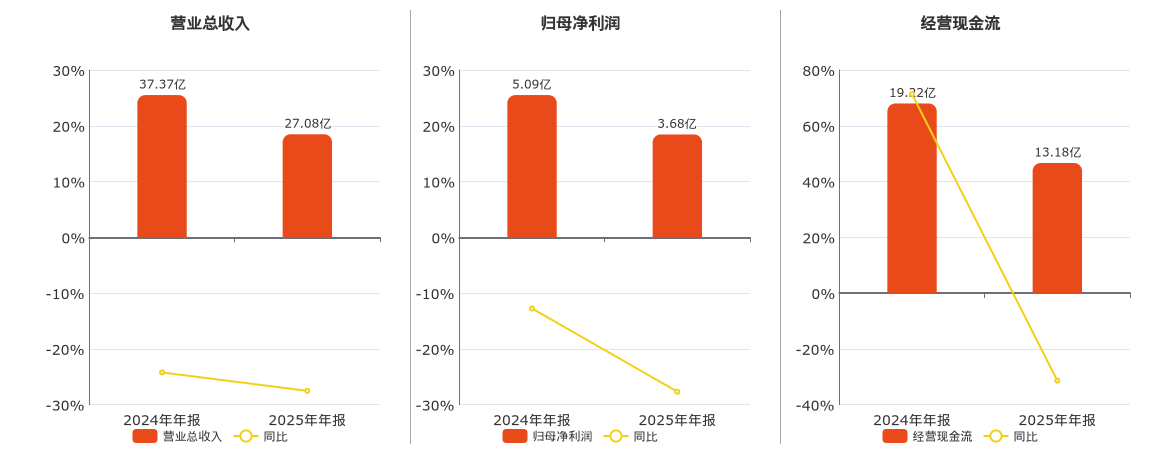 公司营业总收入为27.08亿元,在已披露的同业公司中排名第19,较去年同报告期营业总收入减少10.29亿元,同比较去年同期下降27.53%。归母净利润为3.68亿元,较去年同报告期归母净利润减少1.41亿元,同比较去年同期下降27.68%。经营活动现金净流入为13.18亿元,较去年同报告期经营活动现金净流入减少6.03亿元,同比较去年同期下降31.40%。