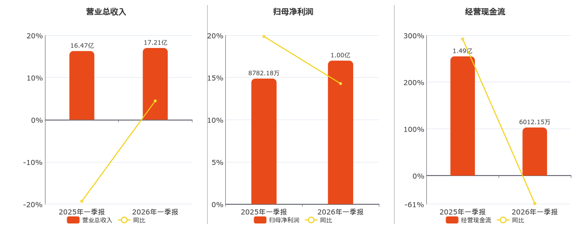 公司营业总收入为17.21亿元,较去年同报告期营业总收入增加7347.42万元,同比较去年同期上涨4.46%。归母净利润为1.00亿元,较去年同报告期归母净利润增加1254.33万元,实现4年连续上涨,同比较去年同期上涨14.28%。经营活动现金净流入为6012.15万元。