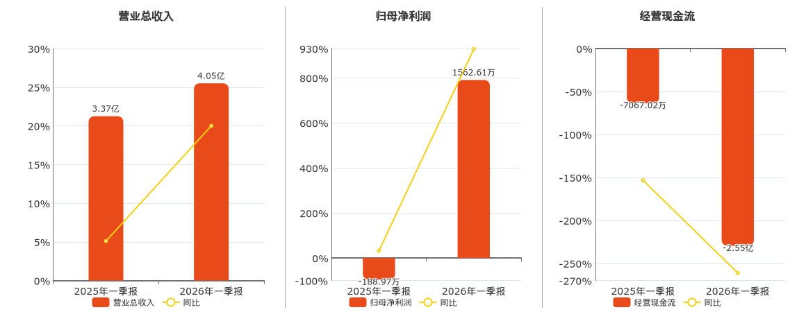公司营业总收入为4.05亿元。归母净利润为1562.61万元。经营活动现金净流入为-2.55亿元,较去年同报告期经营活动现金净流入减少1.85亿元。