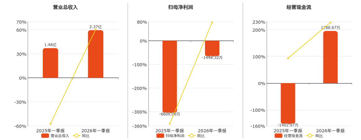 公司营业总收入为2.37亿元,较去年同报告期营业总收入增加8924.42万元,同比较去年同期上涨60.39%。归母净利润为-1448.32万元,较去年同报告期归母净利润增加5160.74万元。经营活动现金净流入为1788.67万元,较去年同报告期经营活动现金净流入增加3191.64万元,实现2年连续上涨。