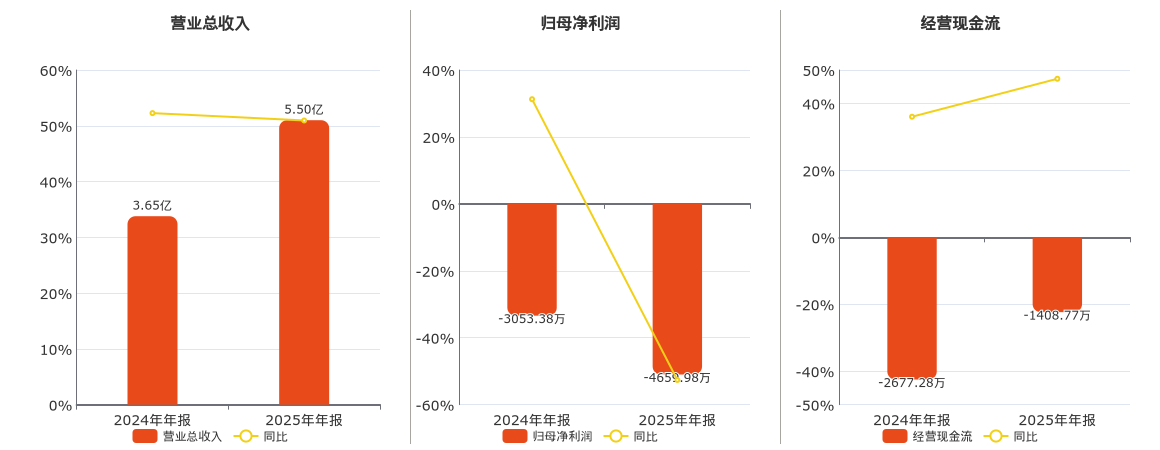 公司营业总收入为5.50亿元,在已披露的同业公司中排名第94。归母净利润为-4659.98万元,在已披露的同业公司中排名第93,较去年同报告期归母净利润减少1606.61万元。经营活动现金净流入为-1408.77万元,在已披露的同业公司中排名第98。