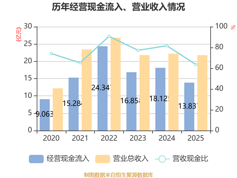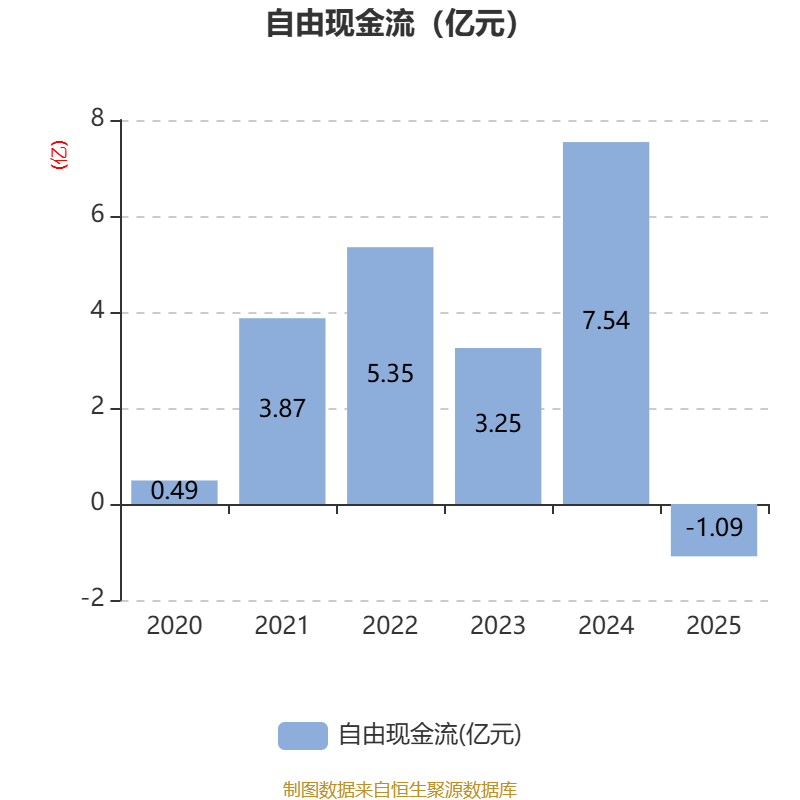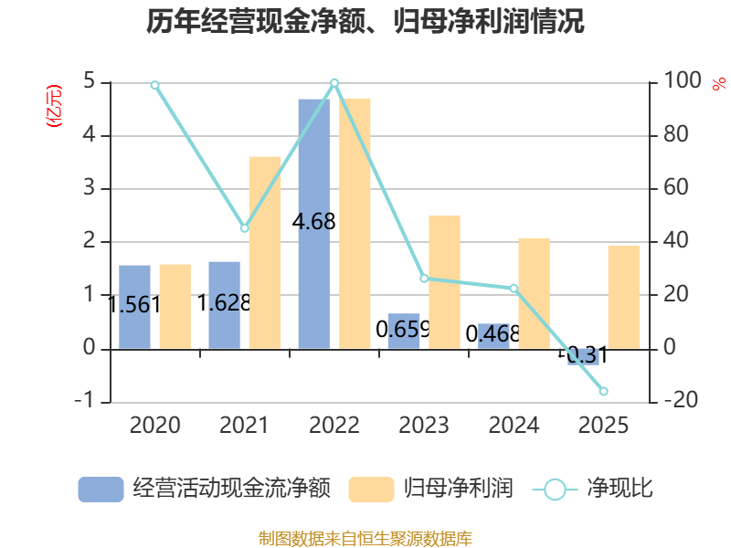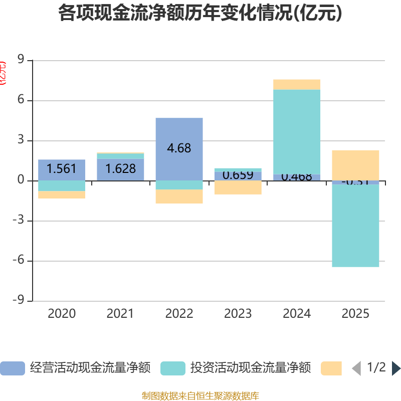 截至2025年,公司经营活动现金流净额为-3098.02万元,同比减少7778.35万元;筹资活动现金流净额2.25亿元,同比增加1.51亿元;投资活动现金流净额-6.17亿元,上年同期为6.34亿元。