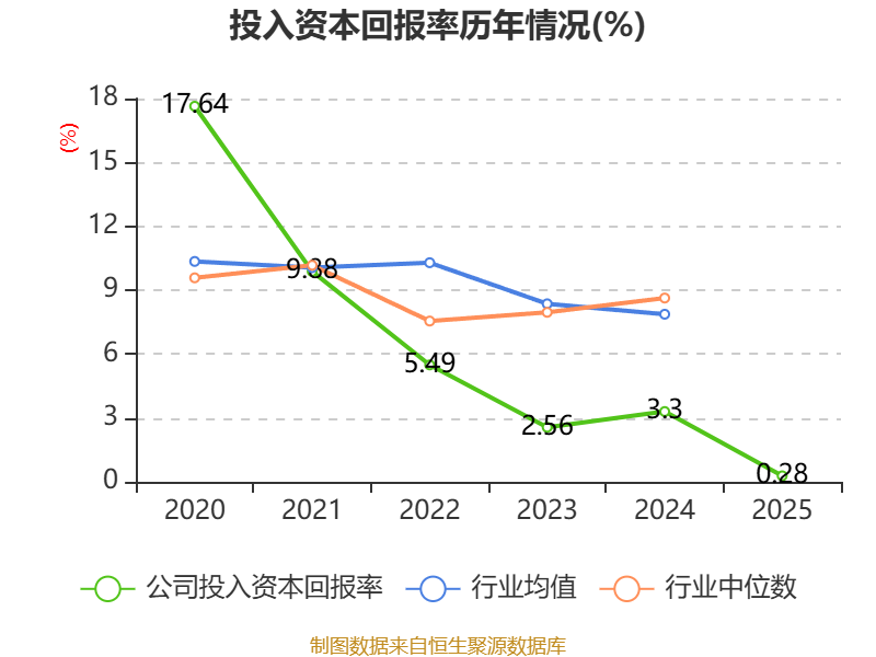 数据显示,2025年公司加权平均净资产收益率为0.66%,较上年同期下降3.94个百分点。公司2025年投入资本回报率为0.28%,较上年同期下降3.02个百分点。