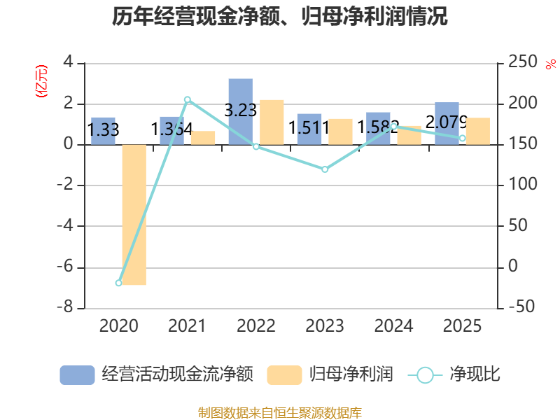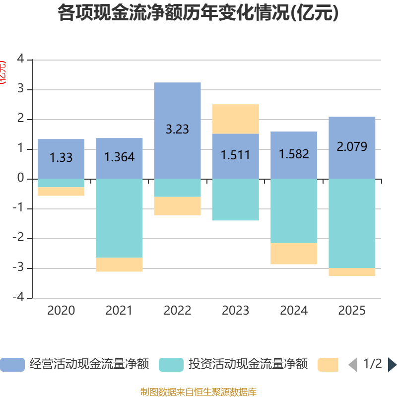 截至2025年,公司经营活动现金流净额为2.08亿元,同比增长31.45%;筹资活动现金流净额-2691.18万元,同比增加4371.71万元;投资活动现金流净额-3亿元,上年同期为-2.17亿元。