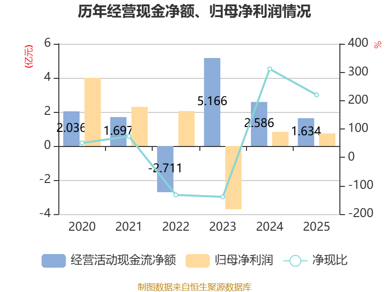 截至2025年,公司经营活动现金流净额为1.63亿元,同比下降36.81%;筹资活动现金流净额-1048.08万元,同比增加1.38亿元;投资活动现金流净额-2.64亿元,上年同期为-3.7亿元。