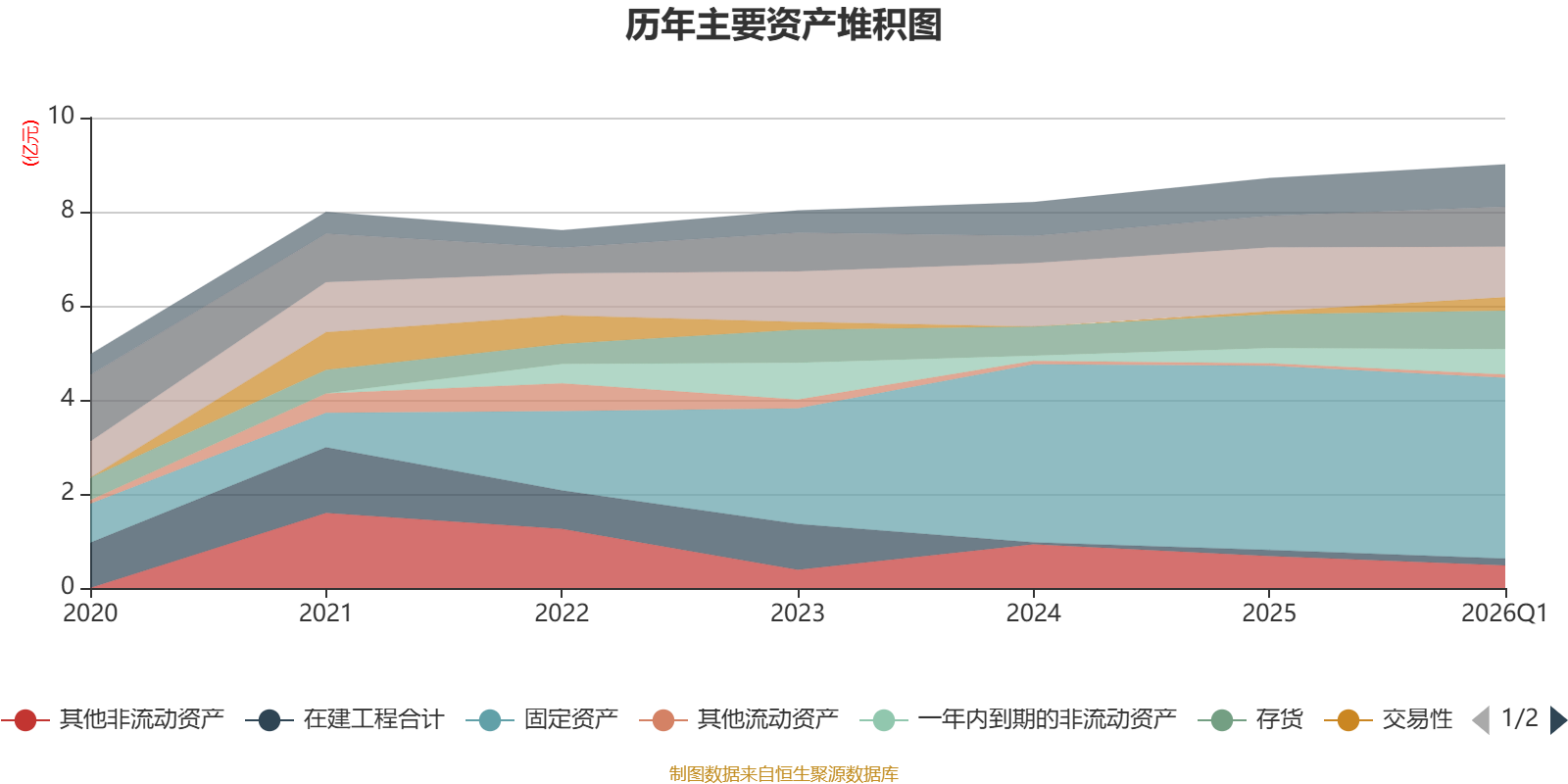 资产重大变化方面,截至2026年一季度末,公司应收票据及应收账款较上年末减少20.93%,占公司总资产比重下降3.67个百分点;其他非流动资产较上年末减少29.42%,占公司总资产比重下降2.46个百分点;交易性金融资产合计较上年末增加340%,占公司总资产比重上升2.42个百分点;一年内到期的非流动资产较上年末增加67.35%,占公司总资产比重上升2.3个百分点。