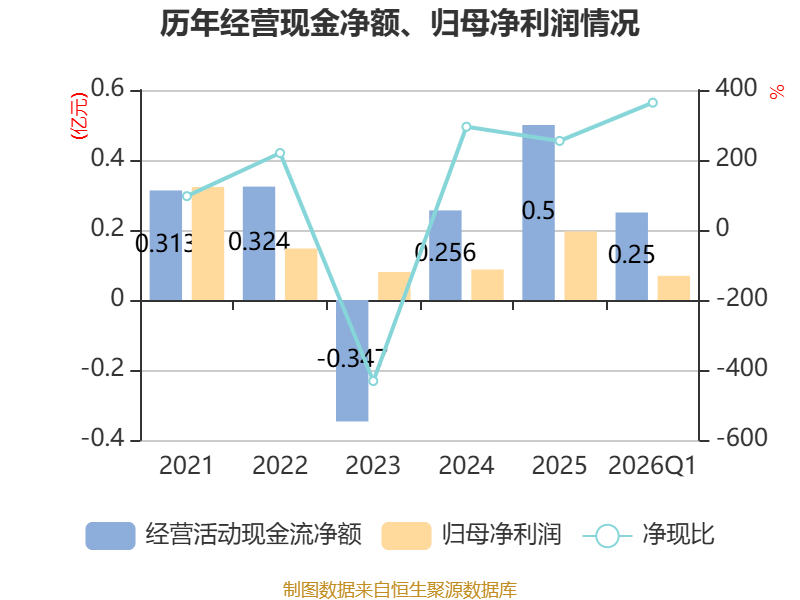 截至2026年一季度末,公司经营活动现金流净额为2499.13万元,同比增长1001.69%;筹资活动现金流净额846.08万元,同比增加857.97万元;投资活动现金流净额-1592.33万元,上年同期为-278.51万元。