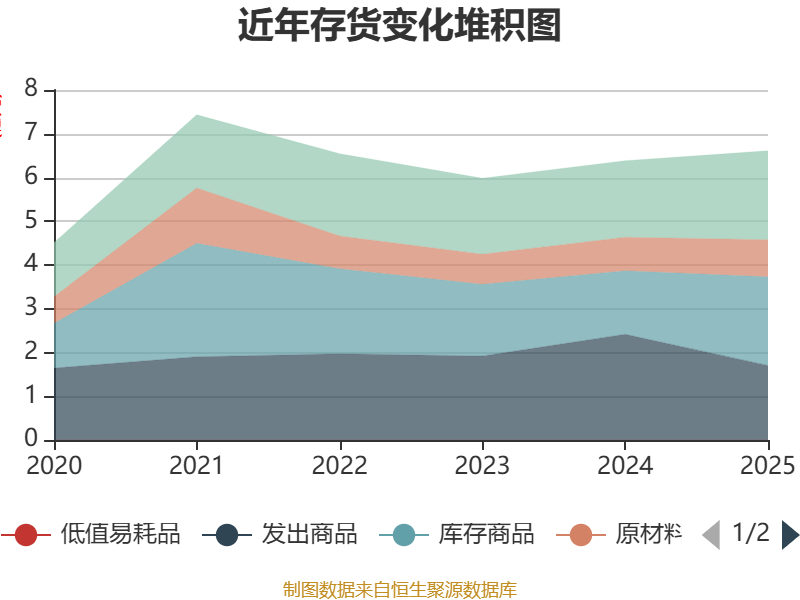 从存货变动来看,截至2025年末,公司存货账面价值为6.61亿元,占净资产的27.48%,较上年末增加2269.28万元。其中,存货跌价准备为5036.32万元,计提比例为7.08%。