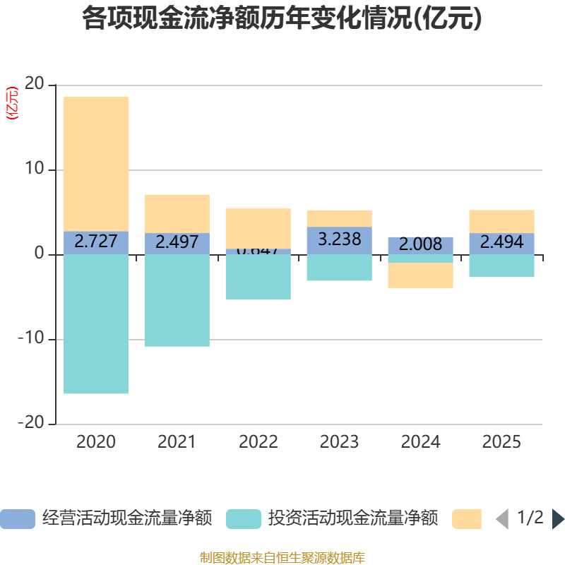 截至2025年,公司经营活动现金流净额为2.49亿元,同比增长24.22%;筹资活动现金流净额2.73亿元,同比增加5.71亿元;投资活动现金流净额-2.67亿元,上年同期为-1.03亿元。