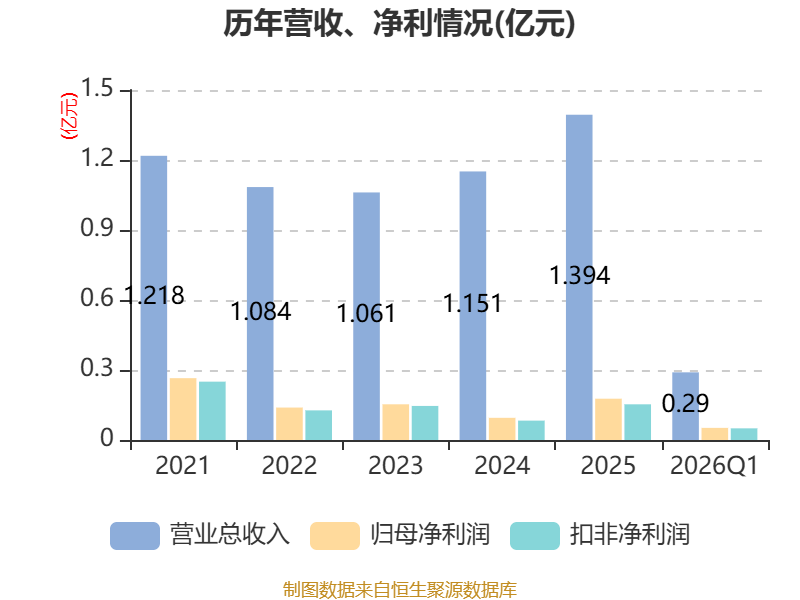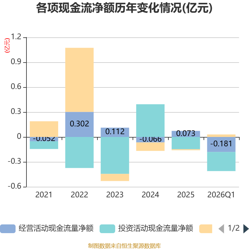 截至2026年一季度末,公司经营活动现金流净额为-1805.16万元,同比减少1017.52万元;筹资活动现金流净额298.63万元,同比增加298.63万元;投资活动现金流净额-2302.1万元,上年同期为-359.18万元。