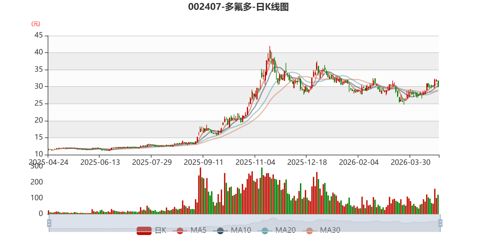 中证智能财讯多氟多(002407)4月24日披露2026年第一季度报告。公司实现营业总收入32.16亿元,同比增长53.26%;归母净利润3.76亿元,同比增长480.14%;扣非净利润3.8亿元,同比增长1724.01%;经营活动产生的现金流量净额为-6.88亿元,上年同期为-2.11亿元;报告期内,多氟多基本每股收益为0.32元,加权平均净资产收益率为4.38%。