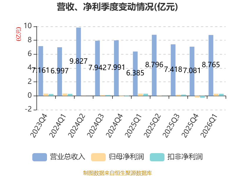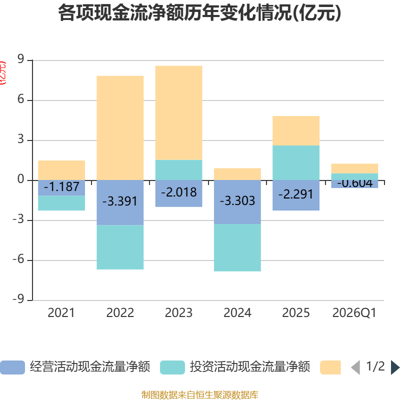 截至2026年一季度末,公司经营活动现金流净额为-6037.7万元,同比增加3621.58万元;筹资活动现金流净额7212.98万元,同比增加1347.47万元;投资活动现金流净额5049.11万元,上年同期为3.47亿元。