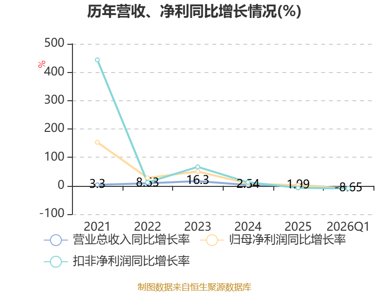 截至2026年一季度末,公司经营活动现金流净额为-2.69亿元,同比减少8733.5万元;筹资活动现金流净额-590.47万元,同比减少25.64万元;投资活动现金流净额-238.14万元,上年同期为-2399.59万元。