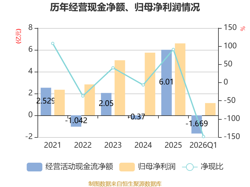 截至2026年一季度末,公司经营活动现金流净额为-1.67亿元,同比减少3.02亿元;筹资活动现金流净额2.45亿元,同比减少4379.4万元;投资活动现金流净额-8.59亿元,上年同期为-1.26亿元。