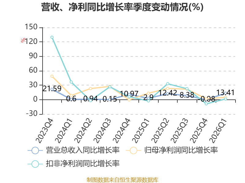 资产重大变化方面,截至2026年一季度末,公司货币资金较上年末减少28.25%,占公司总资产比重下降6.85个百分点;交易性金融资产合计较上年末增加150859.94%,占公司总资产比重上升6.16个百分点;存货较上年末增加13.43%,占公司总资产比重上升2.26个百分点;应收票据及应收账款较上年末减少4%,占公司总资产比重下降1.44个百分点。