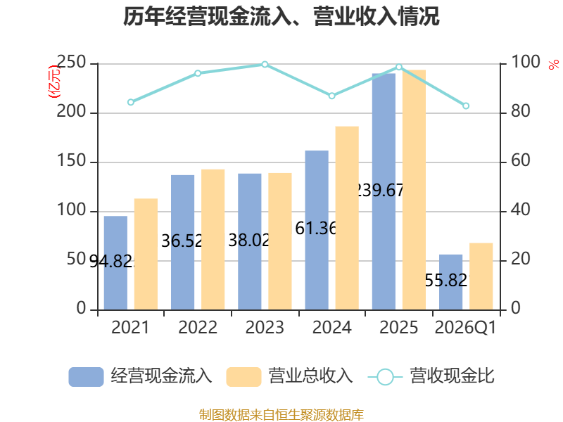 截至2026年一季度末,公司经营活动现金流净额为-4.22亿元,同比增加2.02亿元;筹资活动现金流净额5.88亿元,同比增加4.88亿元;投资活动现金流净额-3.19亿元,上年同期为-1.24亿元。