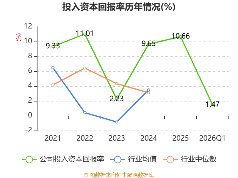 盈利能力方面, 2026年一季度公司加权平均净资产收益率为2.08%,同比下降3.06个百分点。公司2026年第一季度投入资本回报率为1.47%,较上年同期下降1.84个百分点。
