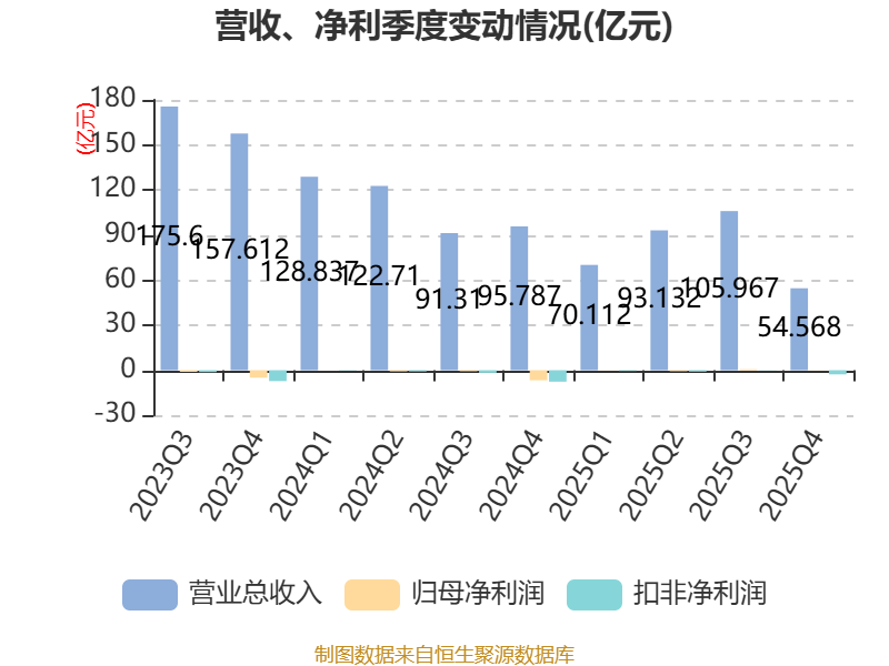 中证智能财讯厦门信达(000701)4月24日披露2025年年度报告。2025年,公司实现营业总收入323.78亿元,同比下降26.19%;归母净利润1524.22万元,同比扭亏;扣非净利润亏损4.02亿元,上年同期亏损10.48亿元;经营活动产生的现金流量净额为3.42亿元,同比下降55.58%;报告期内,厦门信达基本每股收益为-0.1633元,加权平均净资产收益率为-21.45%。