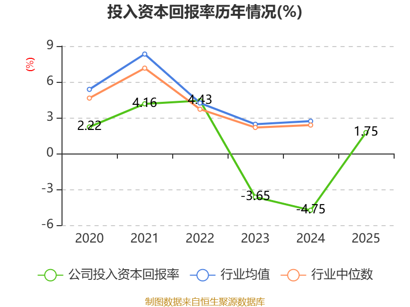 数据显示,2025年公司加权平均净资产收益率为-21.45%,较上年同期上升1067.28个百分点。公司2025年投入资本回报率为1.75%,较上年同期上升6.5个百分点。