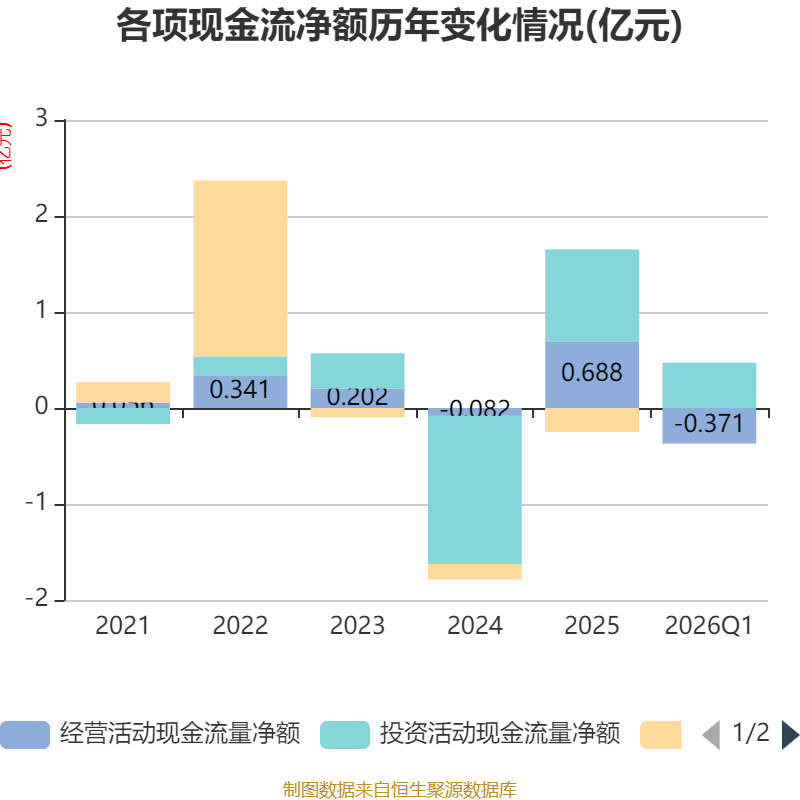 截至2026年一季度末,公司经营活动现金流净额为-3708.94万元,同比减少5752.3万元;筹资活动现金流净额-6.83万元,同比增加6.88万元;投资活动现金流净额4716.3万元,上年同期为1.21亿元。