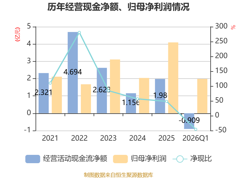截至2026年一季度末,公司经营活动现金流净额为-9090.02万元,同比增加2009.94万元;筹资活动现金流净额8690.09万元,同比增加2712.09万元;投资活动现金流净额5660.98万元,上年同期为2062.22万元。
